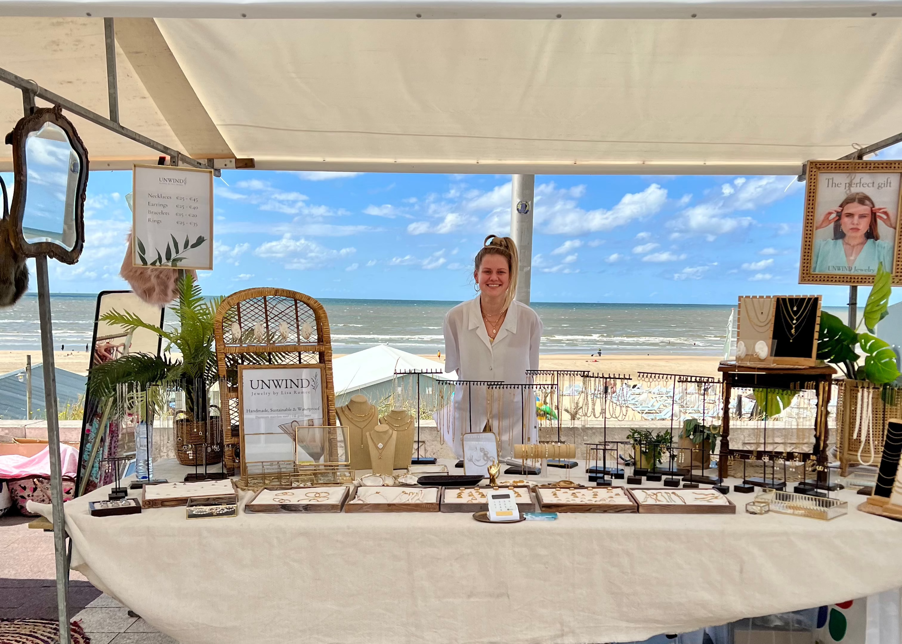 The picture may look serene, but it was anything but that! The wind was so strong that day, sending business cards, jewelry, mirrors–everything–tumbling around. Despite the chaos, it was a wonderful experience being so close to the beach with my jewelry in the Netherlands.